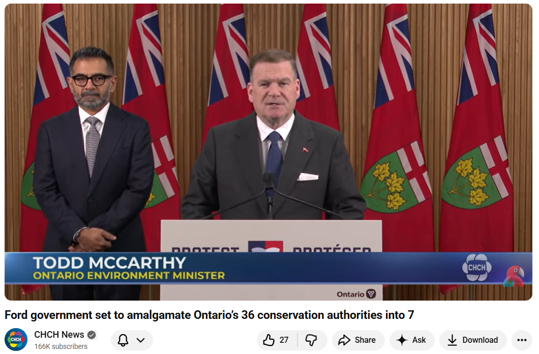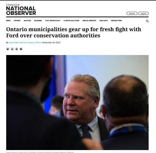 February 2024 Conservation Authority update: Doug Ford’s Conservative Government is coming for our Conservation Authorities. On April 1, 2024 new regulations that gut the Conservation Authority Act will come into effect. Read about them in the news by clicking on the images to the right ->>