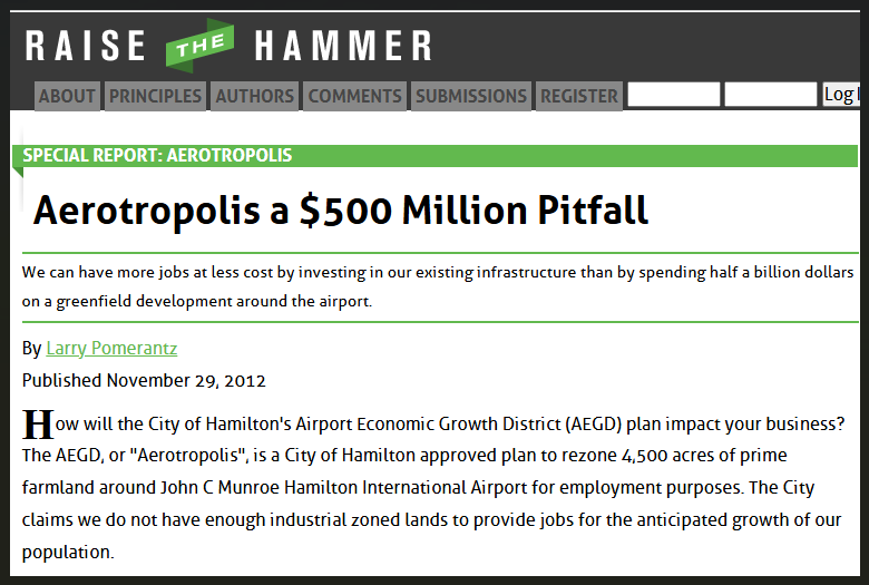 About 2002, the newly amalgamated City of Hamilton embarked on what they called GRIDS (Growth Related Integrated Development Strategy) which mainly focused on expanding the urban area by as much land as possible. These expansions are usually focused on new residential lands, but Hamilton’s population growth was so slow, this could not be justified. This was especially true when the Liberals took over Queens Park with plans to control sprawl. In 2005, they introduced the Greenbelt Plan, as well as the Growth Plan for the Greater Golden Horseshoe that set rules on when municipalities could expand their urban boundaries. It was clear that sprawl was becoming much more difficult, so part of Hamilton’s “answer” was the aerotropolis – an expansion allegedly required to provide for sufficient employment (formerly known as industrial zoning). At the same time, GRIDS was to determine where future residential growth would happen.
