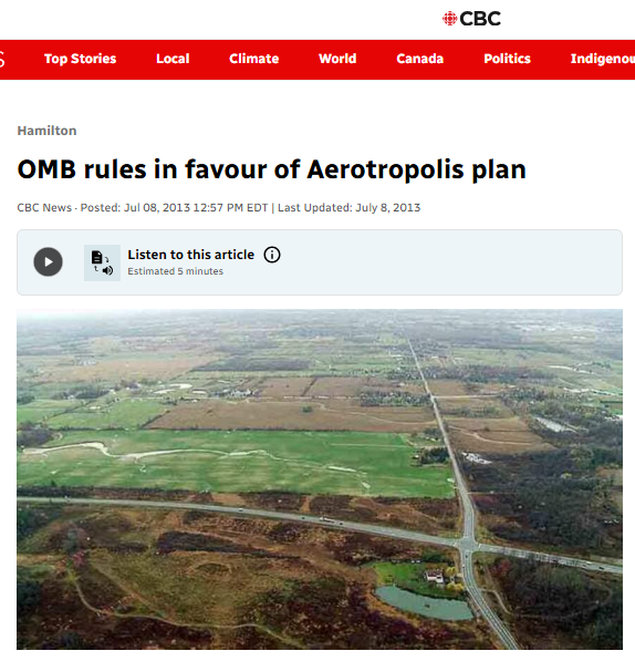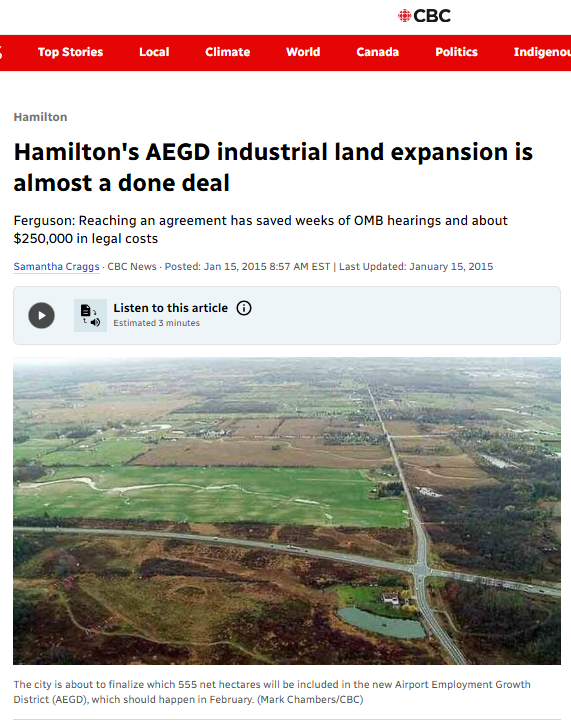 There was a lot of public opposition to the formation of the aerotropolis – sufficient that the city changed its name to AEGD – led by Environment Hamilton and a new group called Hamiltonians for Progressive Development (HPD). There was also push back from provincial planners on the proposed size of the AEGD. The combination of public and provincial pressure whittled down the size of the AEGD from the original proposal. Both Environment Hamilton and HPD appealed the city’s plans but the OMB eventually approved an AEGD of 551 net hectares of developable land (695 gross hectares) in 2014.